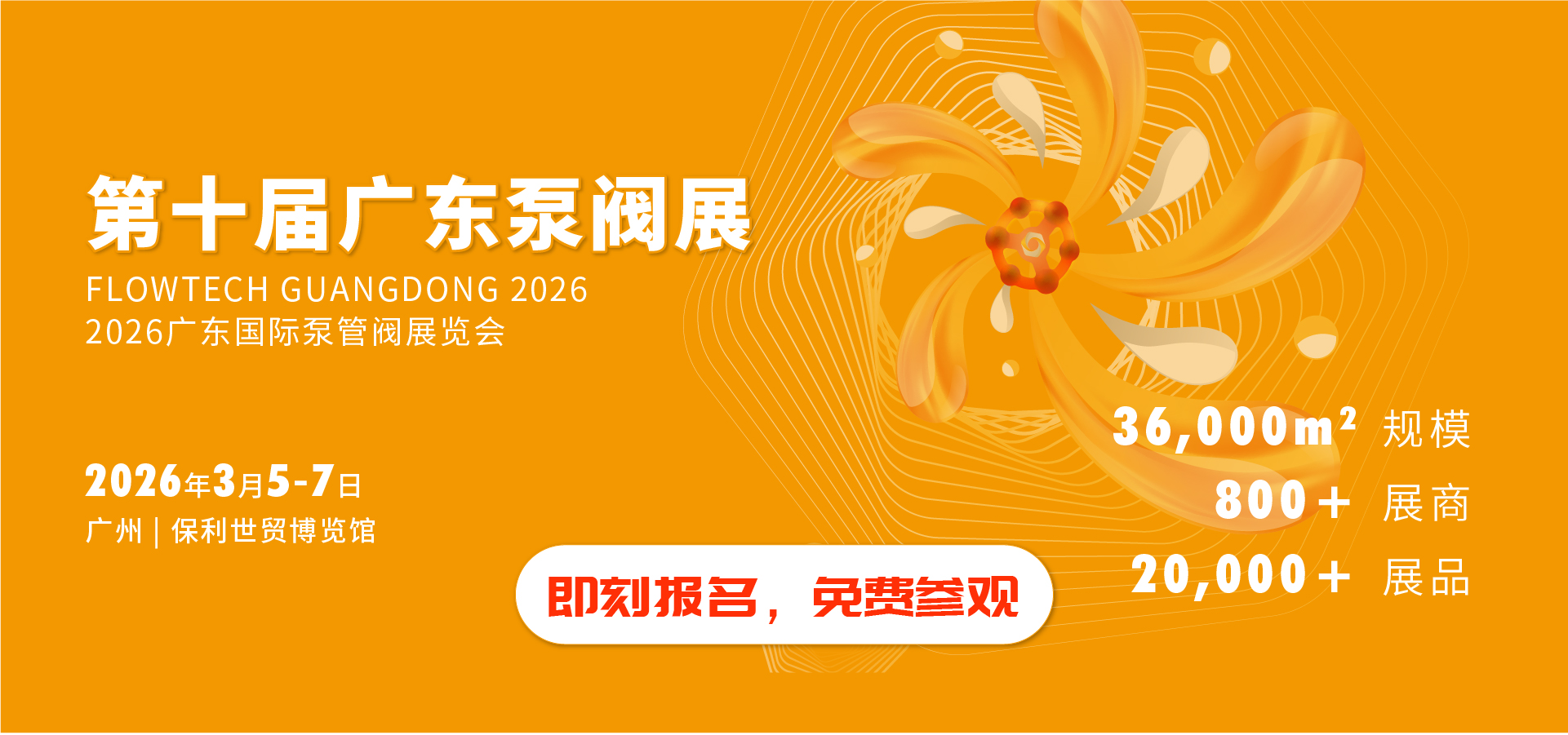 第十屆廣東泵閥展將于2026年3月5-7日在廣州丨保利世貿(mào)博覽館盛大啟幕!展覽面積達36,000平方米,預計將匯聚超20,000名專業(yè)觀眾,吸引800余家優(yōu)質(zhì)展商踴躍參展。